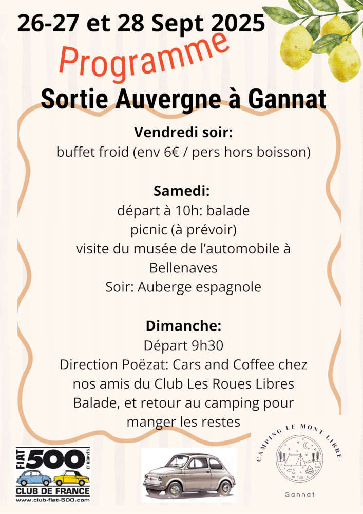 Nous serons au camping « le Mont Libre » à Gannat. Réservez votre emplacement ou hébergement dès maintenant en indiquant que vous faites partie du club fiat 500 et dérivés.