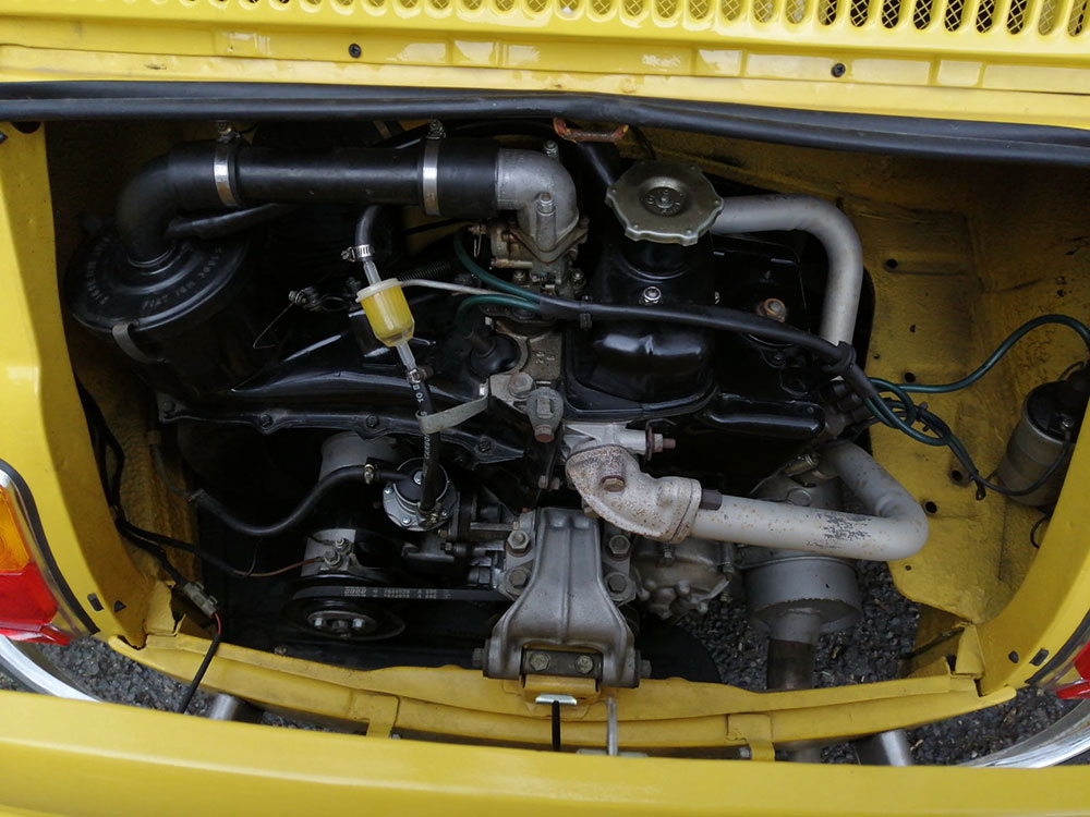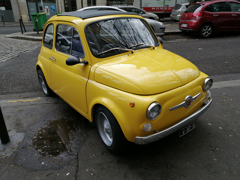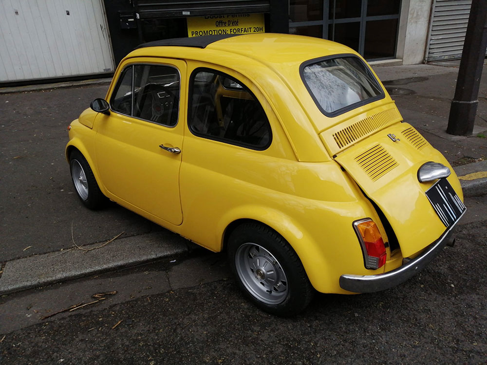 Malheureusement à cause de problème de santé, vends très belle Fiat 500 L jaune Ferrari « type ABARTH » de janvier 1972.