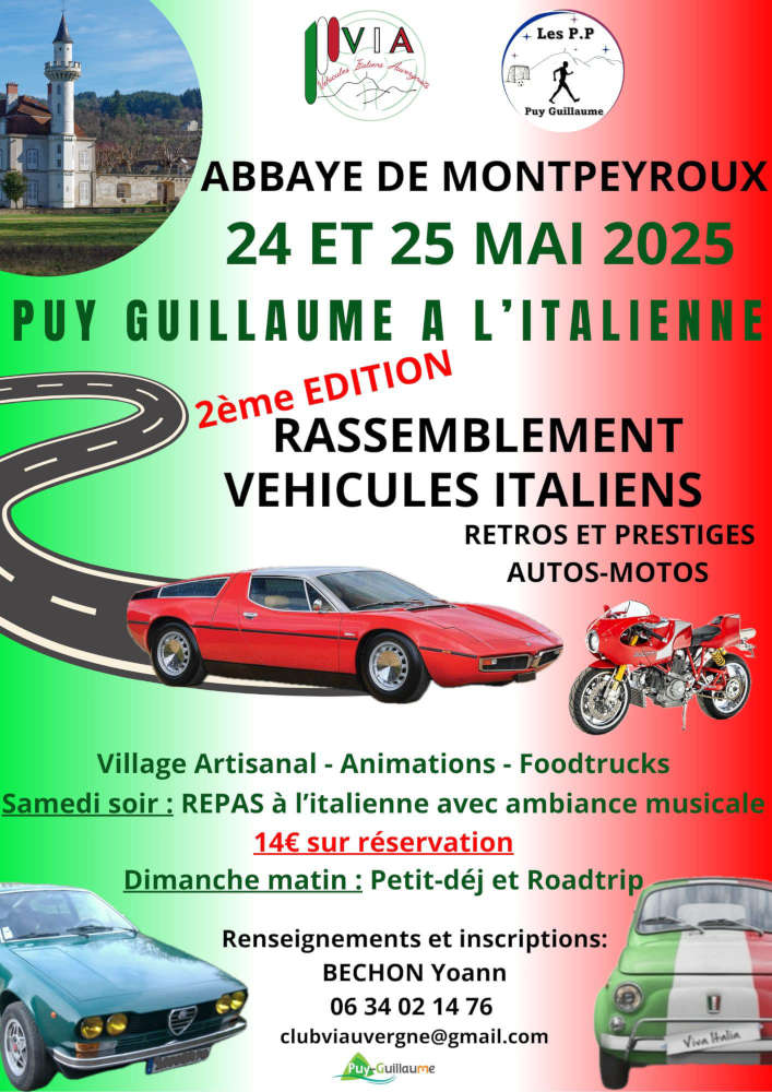 Organisé par l’association « les PP » et le club « VIA », ce second rassemblement « d’italiennes » vous donne rendez-vous le week-end des 24 et 25 mai 2025 à l’abbaye de Montpeyroux à Puy-Guillaume.