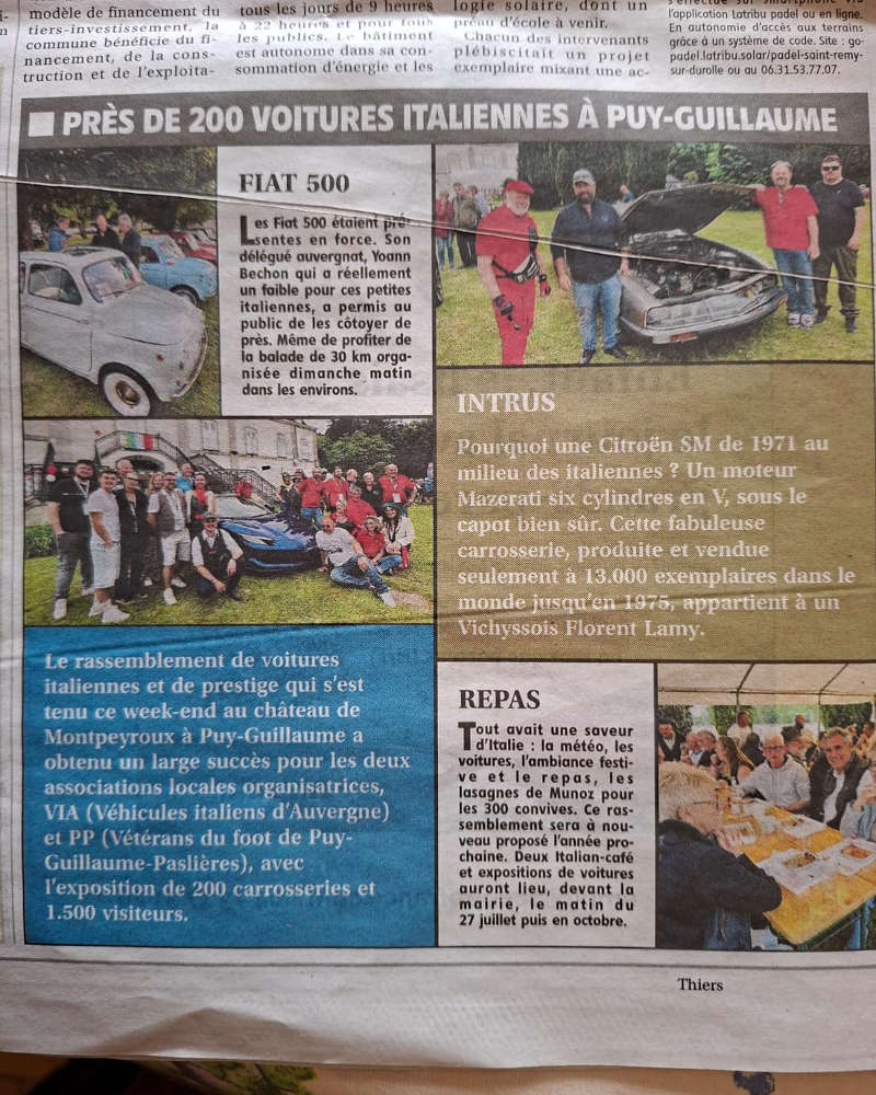 Après une première manifestation le 1er juin 2024, la délégation auvergnate du Club, Yoann et Laëtitia BECHON a remis ça avec une nouvelle structure, le club VIA (Véhicules Italiens Auvergnats) et l’association PP (Vétérans du foot de Puy-Guillaume-Paslières) le week-end des 24 et 25 mai 2025.