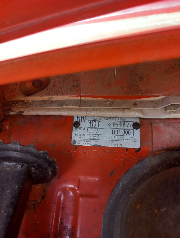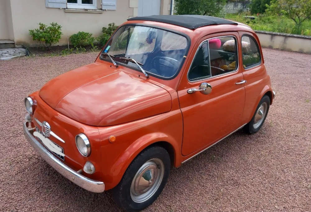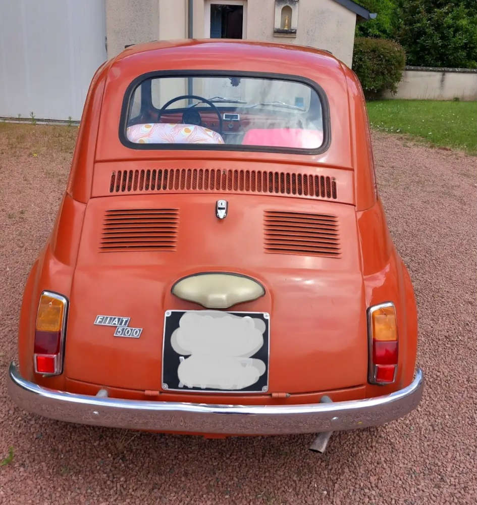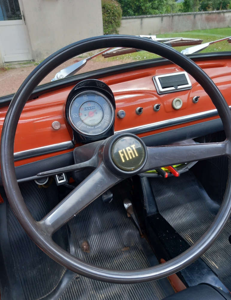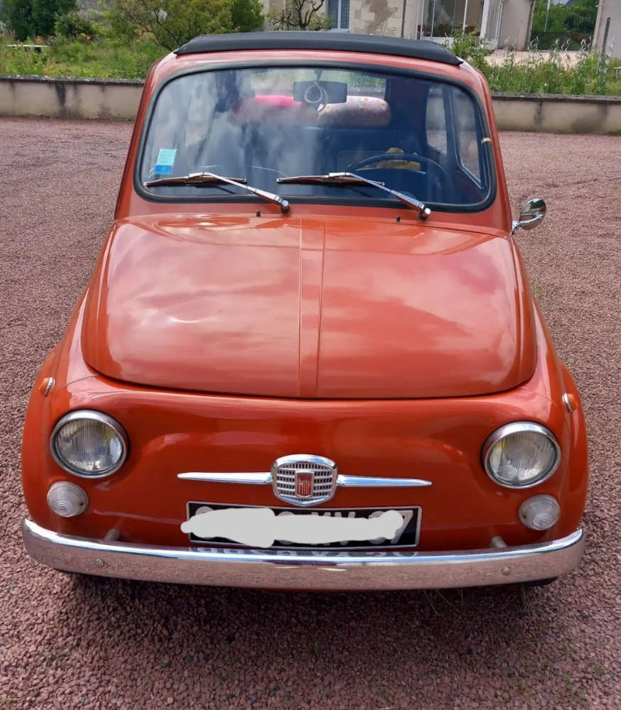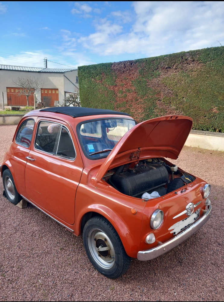 Fiat 500 110 F de 1972, en carte grise de collection. Roulante (elle assure plutôt bien !), CT validé jusqu’à septembre 2025. Peinture et scellerie d’origine.