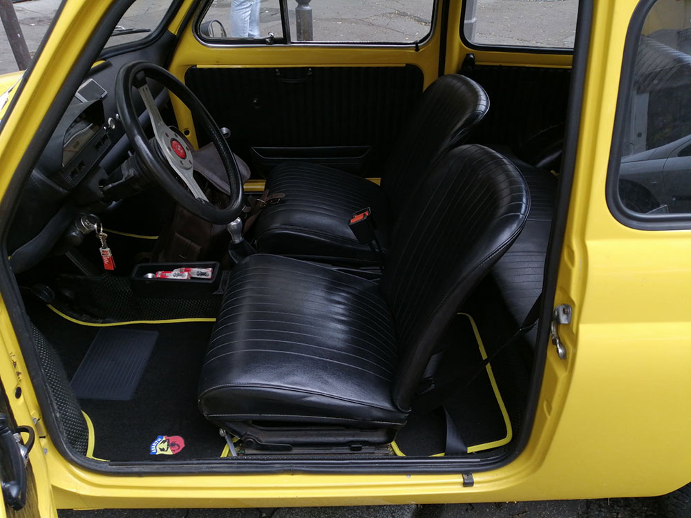 Malheureusement à cause de problème de santé, vends très belle Fiat 500 L jaune Ferrari « type ABARTH » de janvier 1972.
